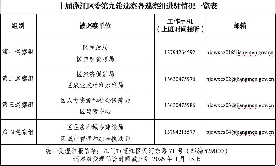 根据中共江门市蓬江区委工作部署,十届区委第九轮巡察工作正在全面展开,时间从2025年11月6日至2026年1月15日。巡察组设立专门联系电话和邮箱,接受群众对被巡察单位的问题反映。主要受理反映被巡察党组织领导班子及其成员、下一级党组织领导班子主要负责同志和重要岗位领导干部在财政专项资金管理使用中违反政治纪律、组织纪律、廉洁纪律、群众纪律、工作纪律、生活纪律等方面的举报和反映。其他不属于巡察受理范围的信访问题,将按规定转有关部门处理。