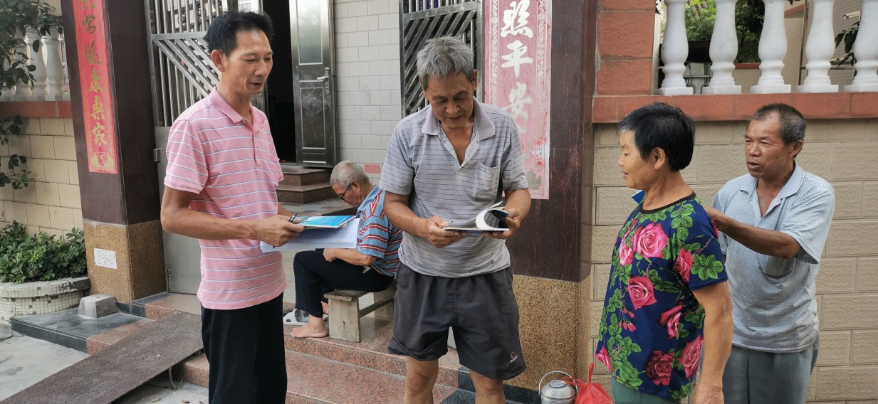 (图为环市街道联合旺七经济社社长向村民发放村务指南)